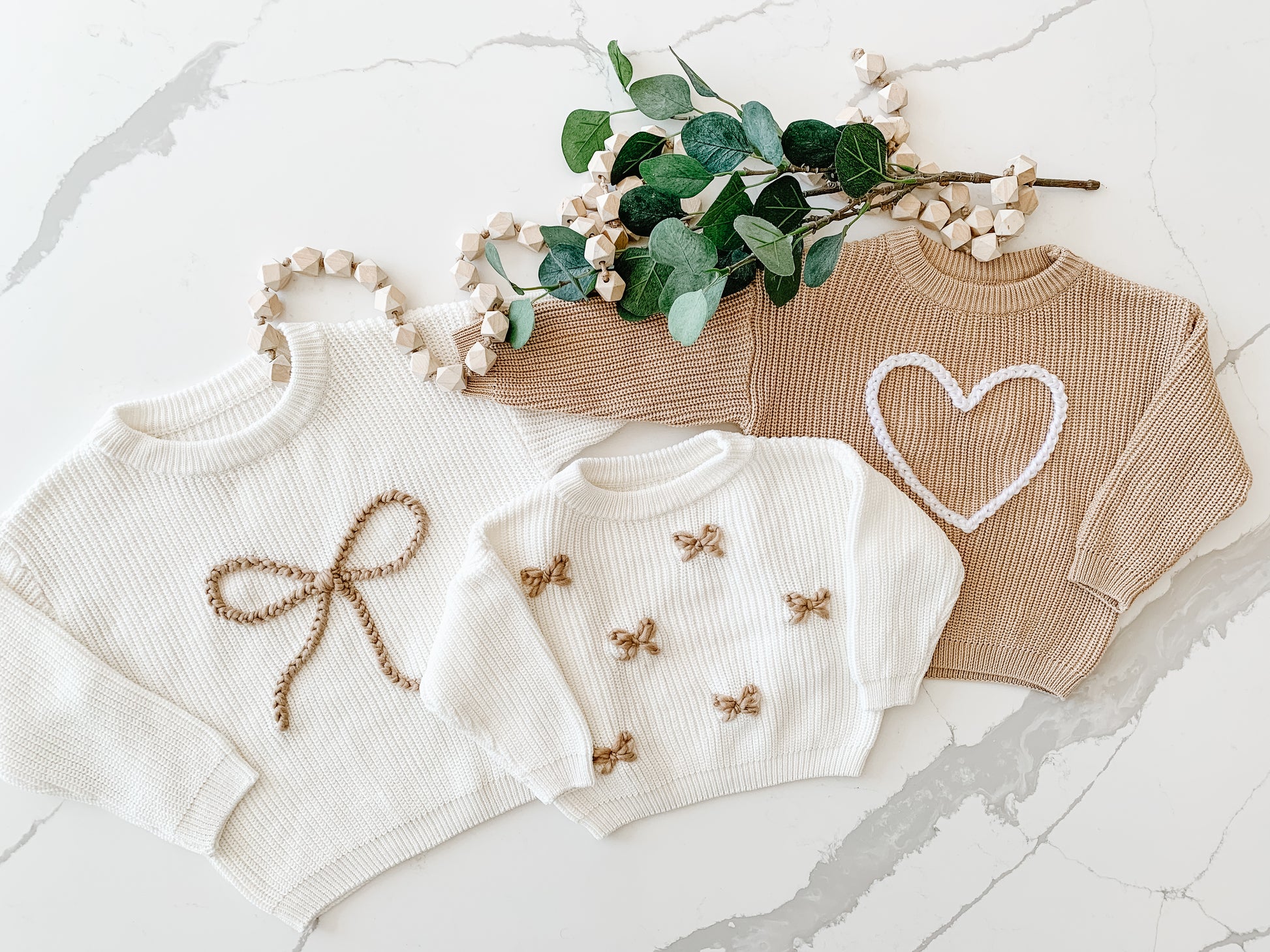 These knits have already been embroidered with the sweetest, most popular designs. With an easy click you can add an ALREADY MADE sweater to your cart "as-is" or email contact@sweetstitches.ca if there is something you would like to add before purchasing.