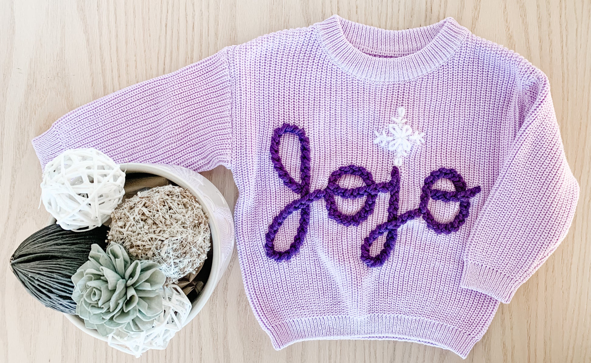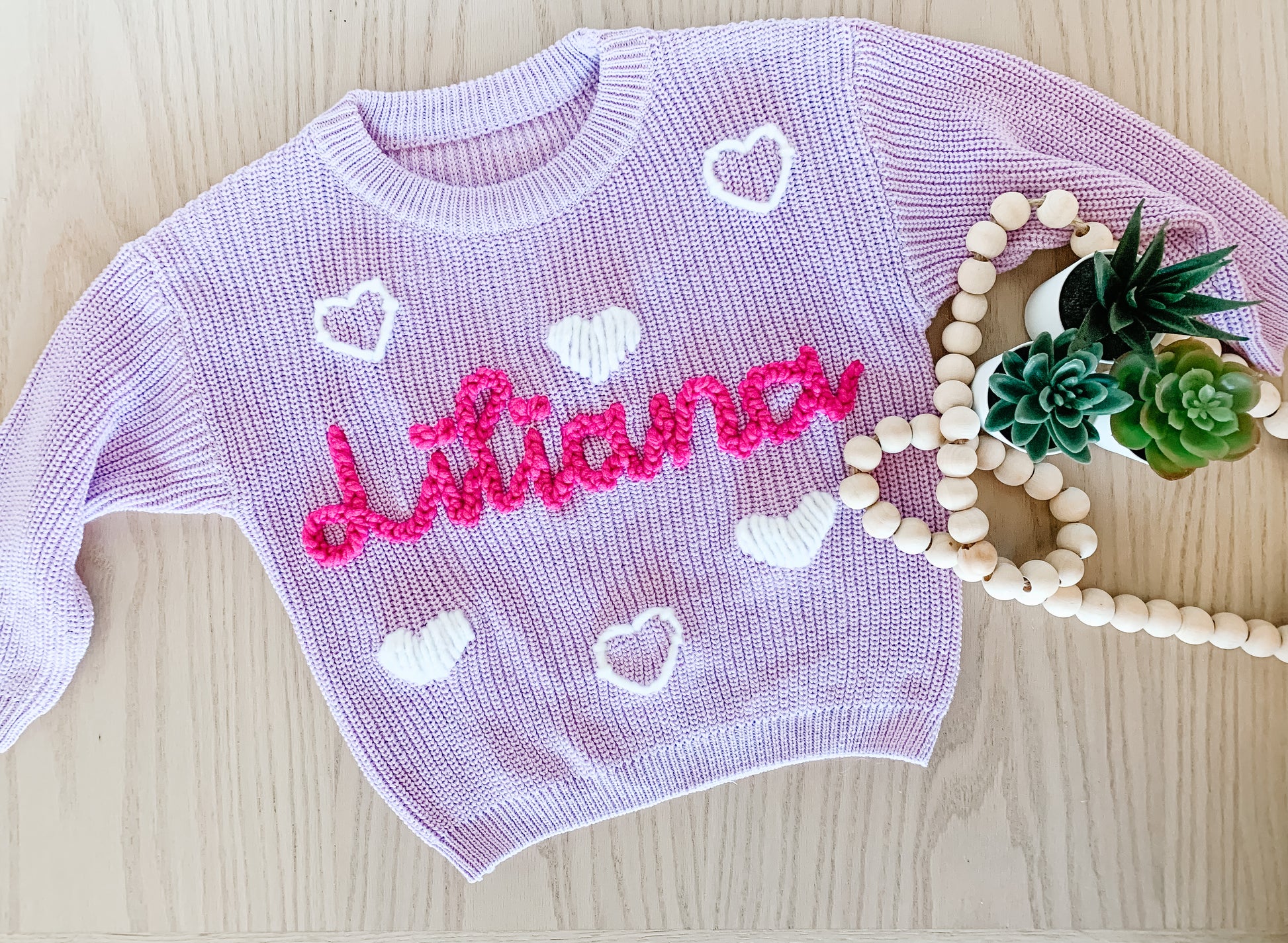- Each sweet knit sweater is designed by you and hand embroidered so no two sweaters are alike. This also means that there are no refunds/exchanges, however, please reach out if there is an issue.