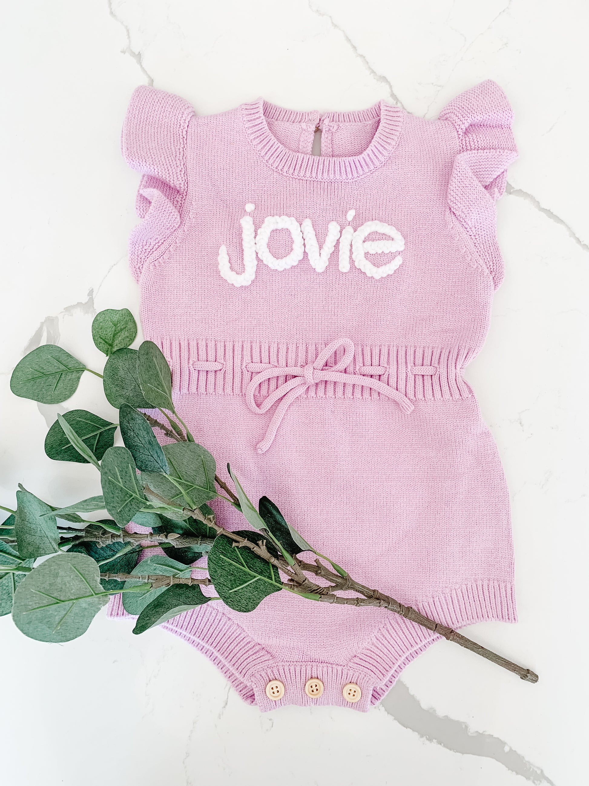 - Each sweet knit romper is designed by you and hand embroidered so no two sweaters are alike. This also means that there are no refunds/exchanges, however, please reach out if there is an issue.